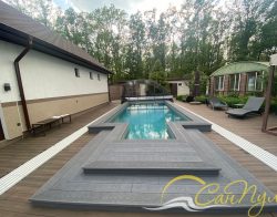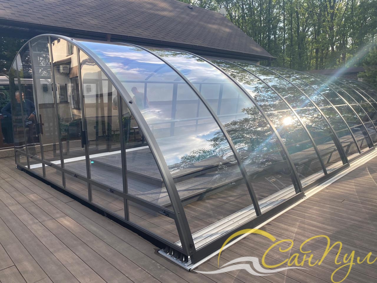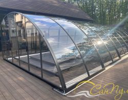 В 2025 году специалисты нашей компании установили телескопический павильон РАВЕНА с секциями из монолитного поликарбоната, цвет профиля Антрацит. Размер павильона 4,5х12,8м высотой 2,4м. Направляющие павильона продлены за чашу бассейна для полного открытия зеркала воды. Чаша бассейна отделана пленкой ПВХ Cefil (Испания) в цвете Гранит текстурный.
